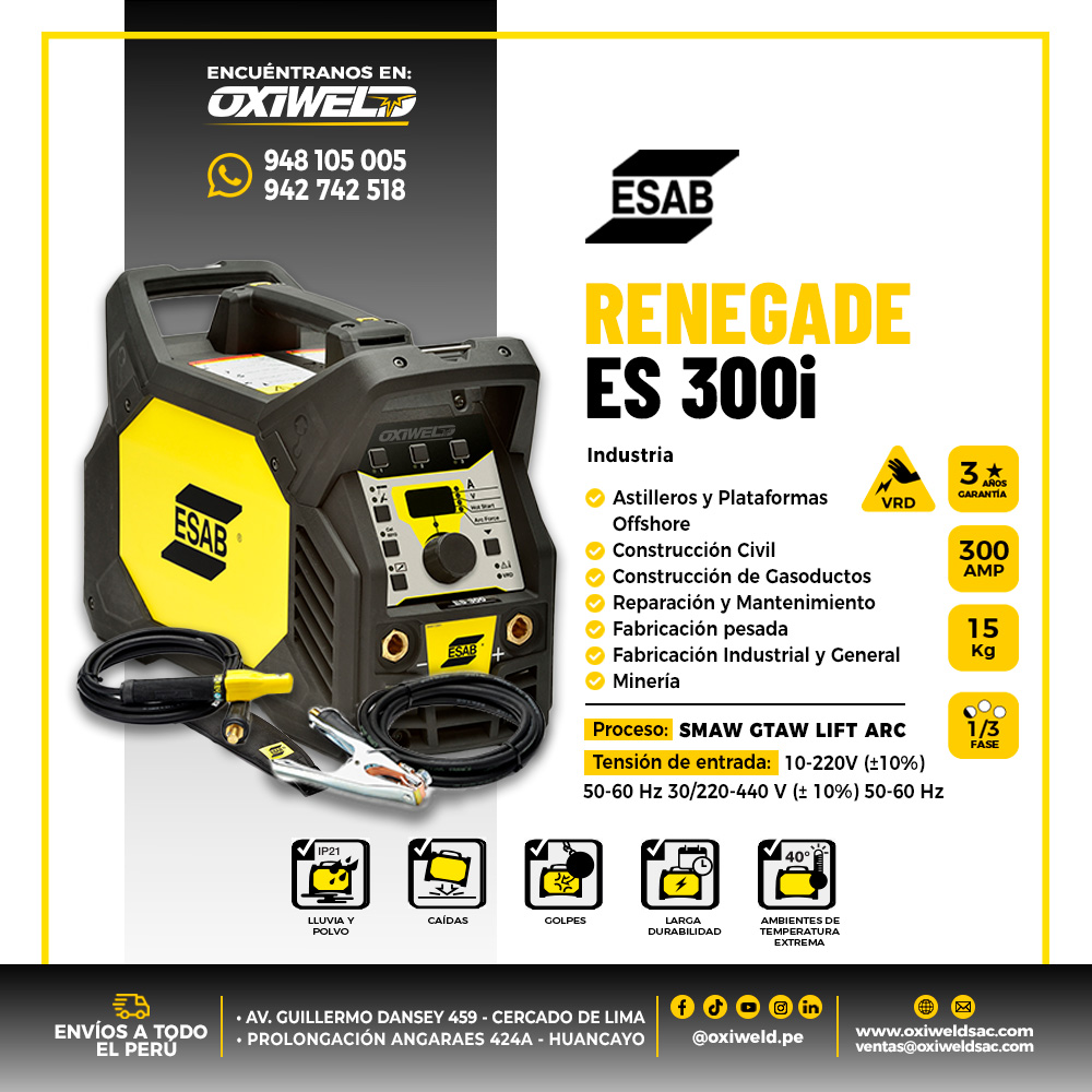 La ESAB Renegade ES 300i es una fuente de poder inverter de alto rendimiento, ideal para aplicaciones profesionales que requieren potencia, precisión y portabilidad. Diseñada para procesos de soldadura con electrodo revestido (SMAW) y TIG (GTAW), esta máquina destaca por su estabilidad de arco y facilidad de uso.