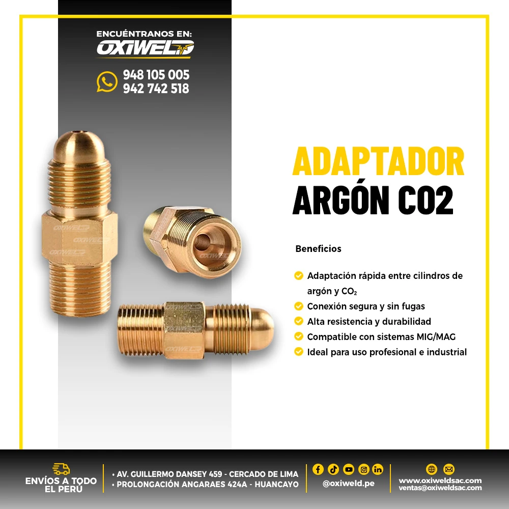 Adaptador de Argón a CO₂ diseñado para convertir conexiones de cilindros de gas en procesos de soldadura MIG/MAG. Permite el uso seguro y eficiente de reguladores compatibles, garantizando un flujo adecuado de gas.