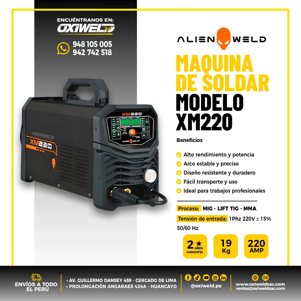 La máquina de soldar Alienweld modelo XM220 es una excelente opción para trabajos profesionales y exigentes, ofreciendo alto rendimiento y estabilidad en cada proceso de soldadura.