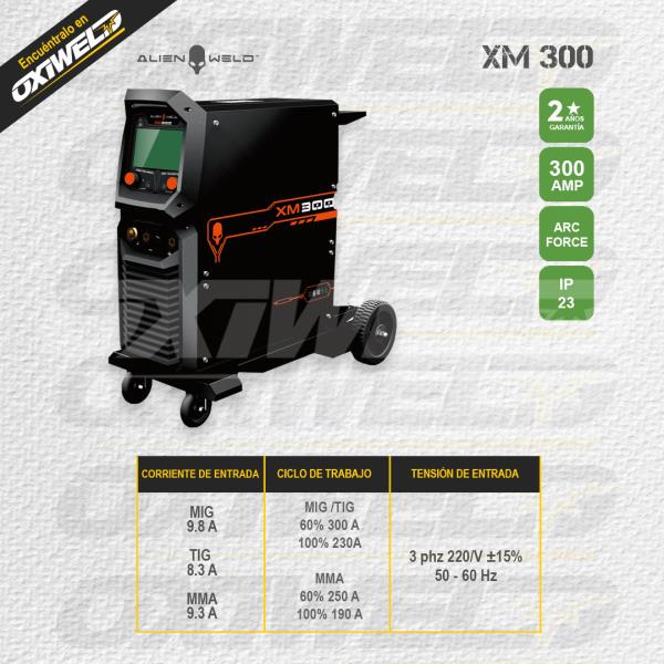 Alienweld XM300 es el equipo mas sofisticado de la línea XM de Alienweld, es un equipo Multiprocesos MIG/TIG/MMA potente, está equipado con componentes de alta calidad, lo que garantiza una excepcional performance en todos los procesos, este equipo cuenta con un ciclo de trabajo pesado y viene equipado con sistemas de protección de corriente, voltaje y temperatura. Esta Fuente cuenta con un Microprocesador de 32 bits, que optimiza la eficiencia energética y entrega salidas de corriente mas estables y potentes que equipos de anteriores generaciones y tecnologías.