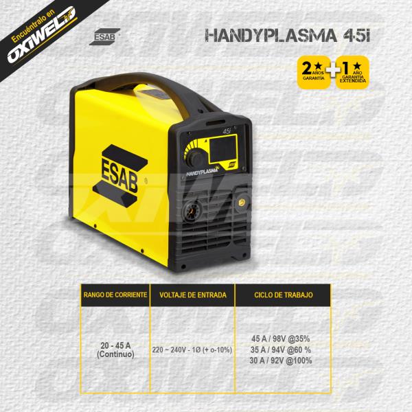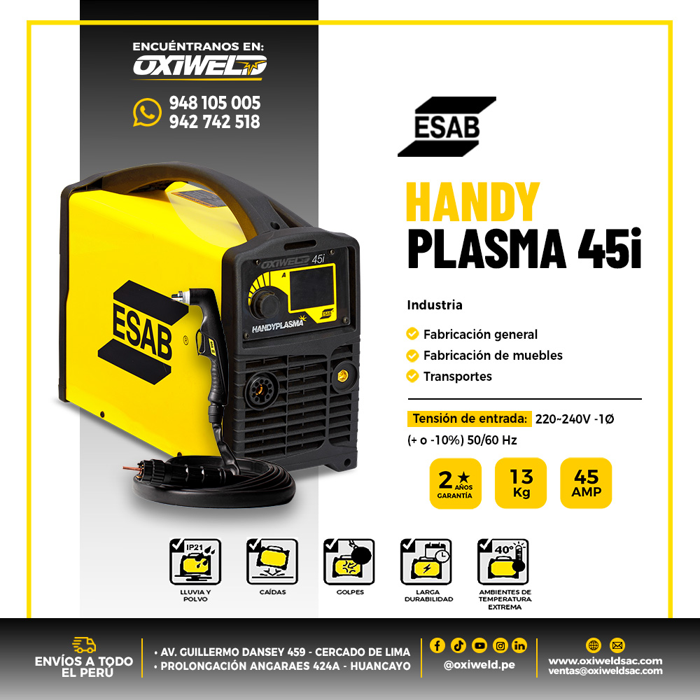 La ESAB HandyPlasma 45i es un equipo inversor de corte por plasma manual diseñado para brindar portabilidad, facilidad de uso y alto rendimiento en aplicaciones industriales y de taller. Funciona con alimentación monofásica de 220V, lo que la hace ideal para trabajos en campo o espacios reducidos.