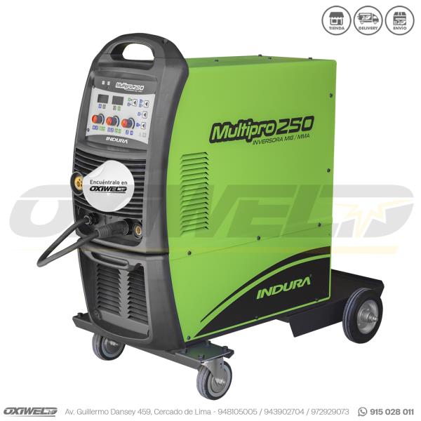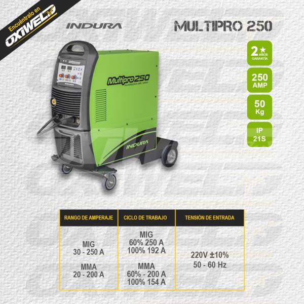 Los equipos MULTIPRO 250, son equipos electrónicos con tecnología inversora, diseñados para uso semi-industrial, se caracterizan por incluir dos procesos de soldadura, MIG y MMA (Arco manual), permiten optimizar el control del arco eléctrico por el ajuste uniforme de la corriente de soldadura, gracias a sus componentes utilizados, tales como, IGBT (transistor bipolar con puerta aislado) de avanzada tecnología con frecuencia de trabajo de 20 Khz. y componentes principales de sus sistemas electrónicos. La línea MULTIPRO posee una corriente de soldadura regulada de manera uniforme, permitiendo la adaptación y obtención de excelentes procedimientos de soldadura, alta seguridad para el operador y es ampliamente utilizada en procesos de soldadura.