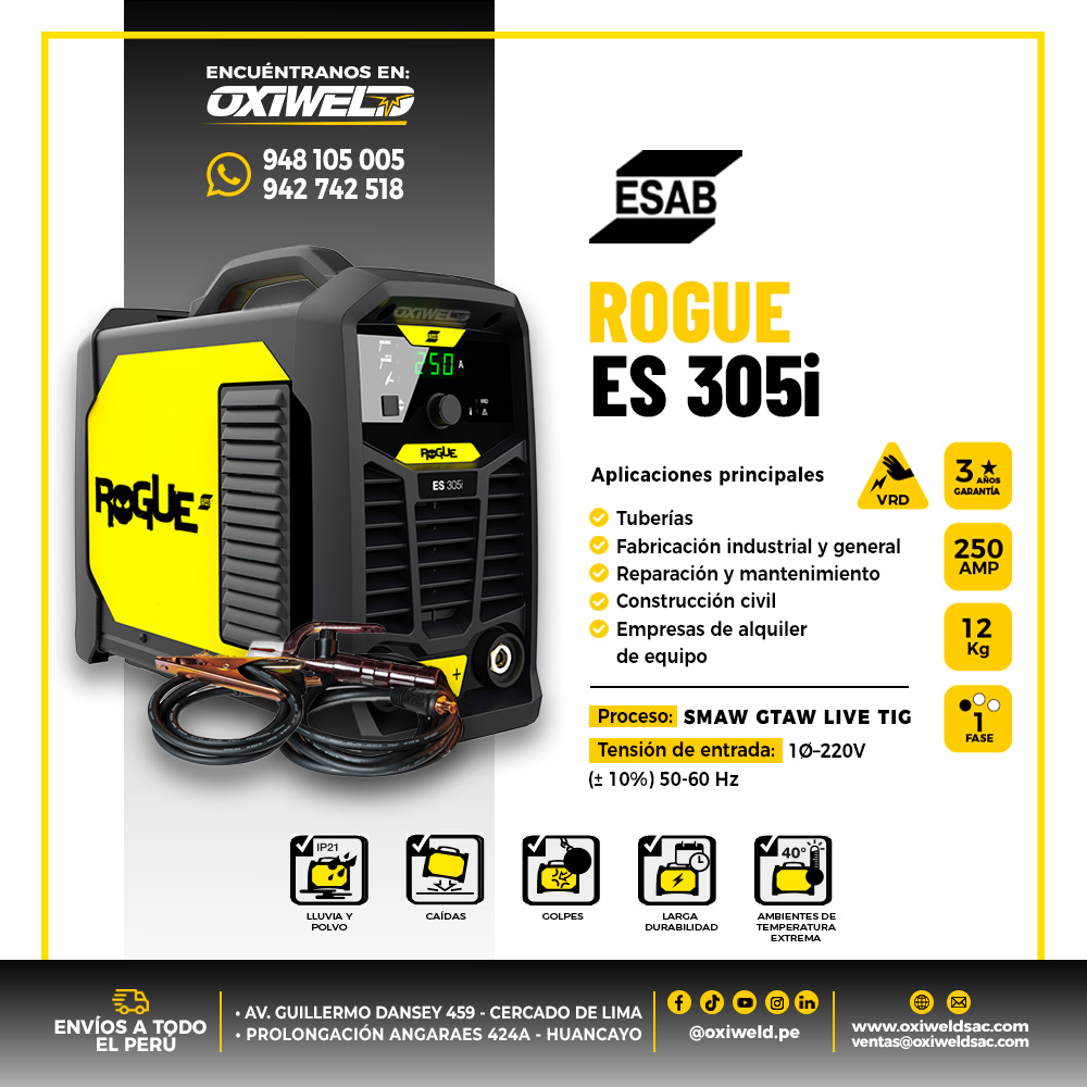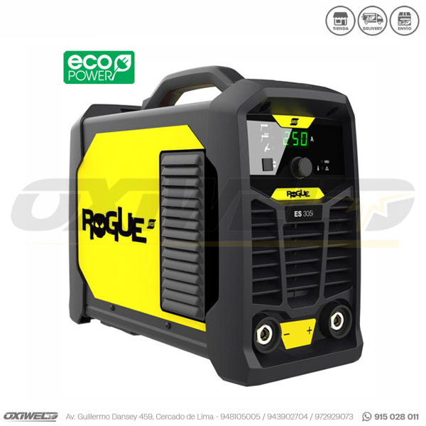 La Rogue ES305i es un inversor de soldadura industrial para aplicaciones de soldadura con electrodo revestido (MMA) y TIG con encendido por contacto (Live TIG – GTAW).