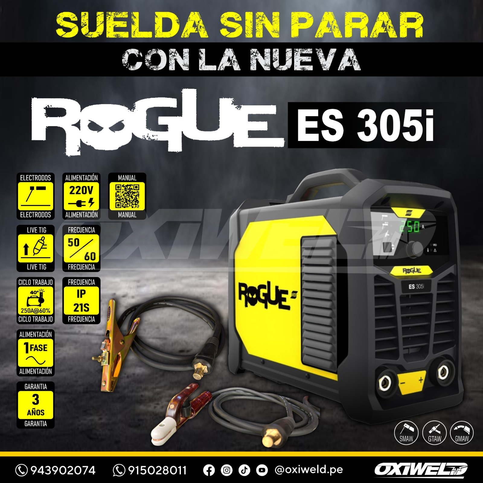 - Ciclo de Trabajo – Electrodos (SMAW): 250 A / 30V @ 60% | 194 A / 27,7V @ 100%