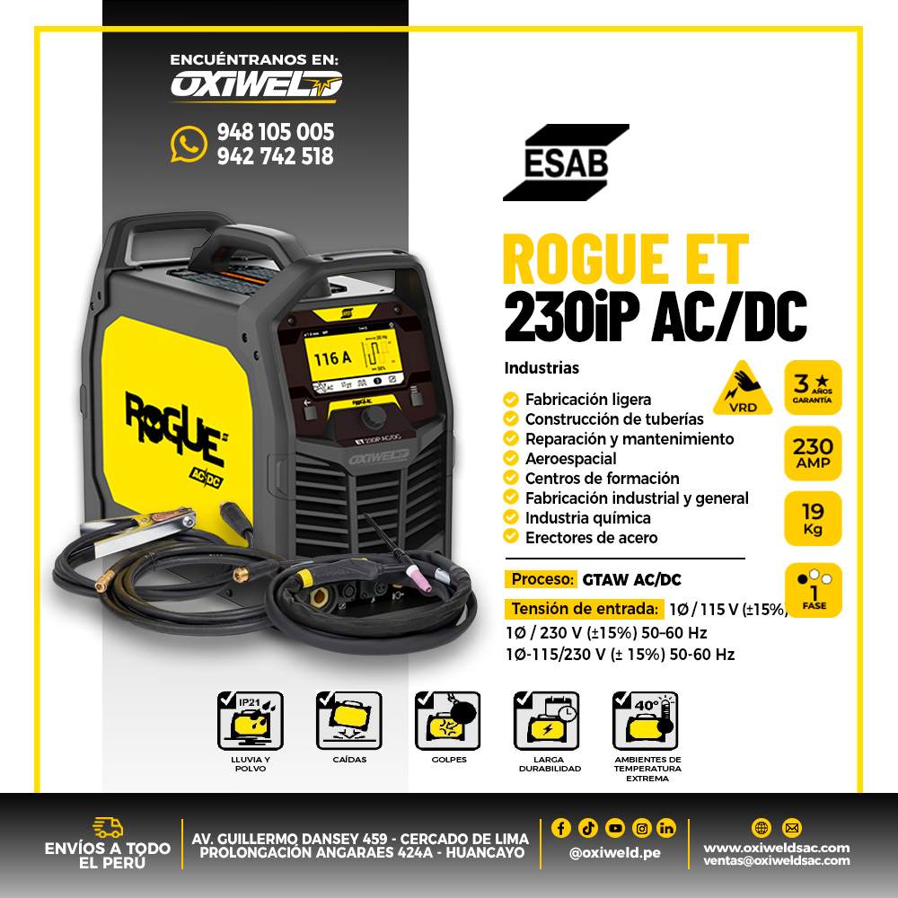 La Rogue ET 230iP AC/DC es un equipo de soldadura TIG AC/DC profesional, portátil y de alta calidad con opciones de parámetros ampliadas para destacar en la soldadura de aluminio, acero inoxidable y acero al carbono.