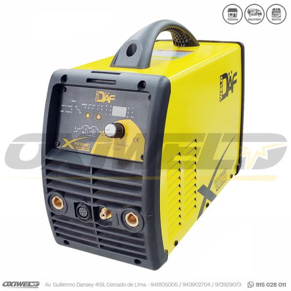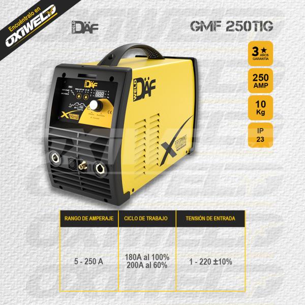 La máquina GMF 250 tig, esta equipado con sistemas de protección de temperatura, voltaje y sensor de corriente. Control de amperaje variable con medidor digital, para una visualización simultánea de la corriente de soldadura. Está desarrollado para trabajar con generadores incluso con picos de voltaje de entrada.