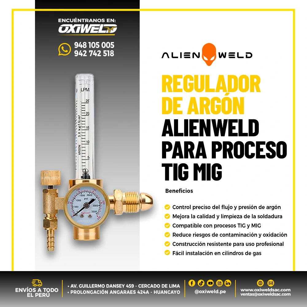 El regulador de argón AlienWeld para proceso TIG y MIG es un componente esencial para garantizar un suministro de gas estable y controlado en trabajos de soldadura profesional.
