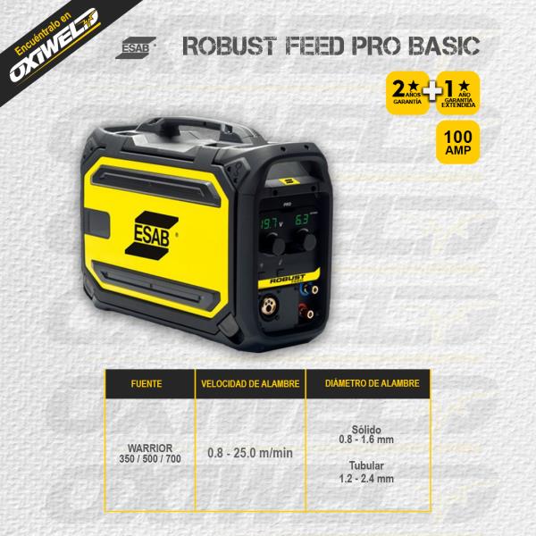 Equipado con un nuevo sistema de accionamiento por cable de precisión con suficiente potencia para manejar alambre sólido de hasta 2,0 mm (5/64 pulg.) y alambre con núcleo de 2,4 mm (3/32 pulg.). Variantes offshore disponibles con medidor de flujo y calentador incluidos. RobustFeed Pro funciona con fuentes de alimentación Warrior.