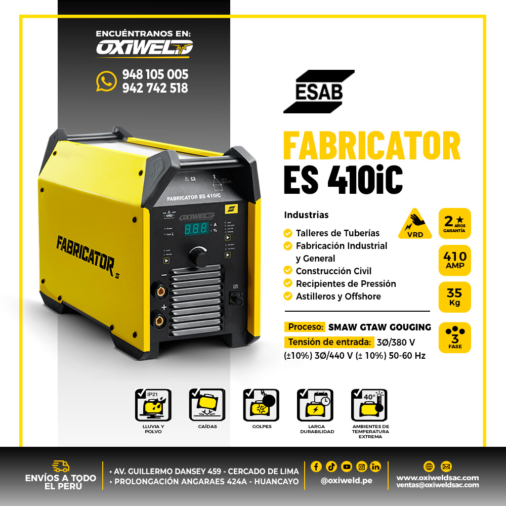La soldadora ESAB Fabricator ES 410iC es un equipo inverter industrial diseñado para trabajos exigentes que requieren alta potencia, durabilidad y estabilidad de arco. Además, está preparada para operar en condiciones severas, lo que la convierte en una excelente opción para uso continuo en talleres y obras.