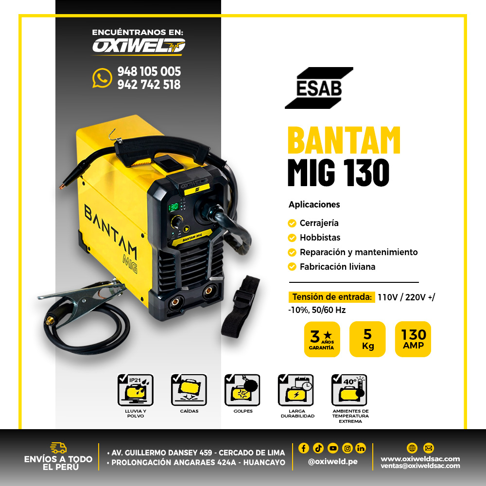 La Bantam MIG 130 es ideal para quienes buscan un equipo económico pero confiable, que ofrezca un buen desempeño sin complicaciones, tanto para soldadura de mantenimiento como para pequeños proyectos de fabricación.