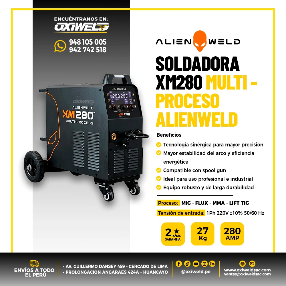 La Soldadora XM280 Multiproceso AlienWeld es un equipo semi-industrial de alto rendimiento diseñado para ofrecer máxima versatilidad en aplicaciones de soldadura profesional. Este equipo permite trabajar con múltiples procesos como MIG (GMAW), Flux (FCAW), MMA (electrodo) y Lift TIG, adaptándose a distintos tipos de materiales y exigencias de trabajo.