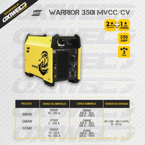 El sistema de soldadura Warrior empareja la Warrior 350i MV de voltaje múltiple y multiproceso con componentes y piezas líderes en la industria para brindar soluciones de soldadura industrial completa. La Warrior 350i MV proporciona 350 amperios con un ciclo de trabajo del 60% y se ajusta automáticamente a la potencia de entrada primaria con la flexibilidad de recibir de 208 a 460 VCA trifásicos.
