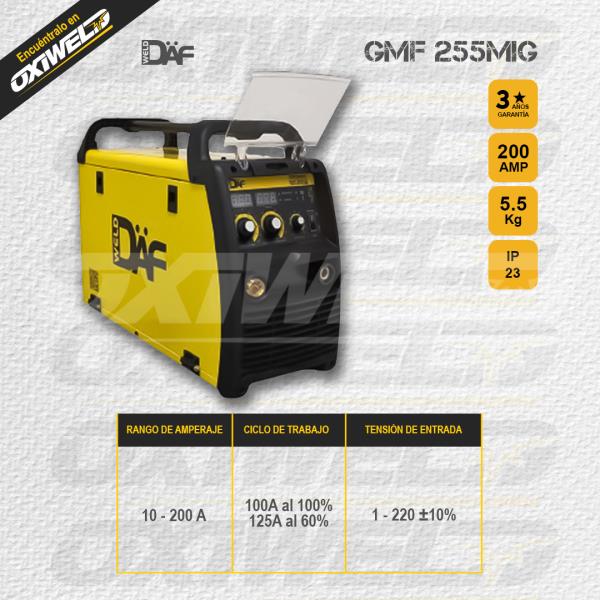 Opera con corriente monofásica (220/230/240V ±10%) y alcanza un ciclo de trabajo de 250A @ 60%, lo que garantiza una producción continua sin interrupciones. Su rango de trabajo va desde 50 hasta 250 amperios, adaptándose a una gran variedad de aplicaciones y materiales.