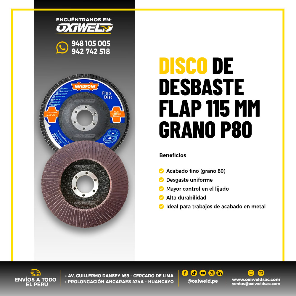 El disco flap P80 Wadfow es una herramienta abrasiva diseñada para trabajos de lijado, acabado y pulido en superficies metálicas.